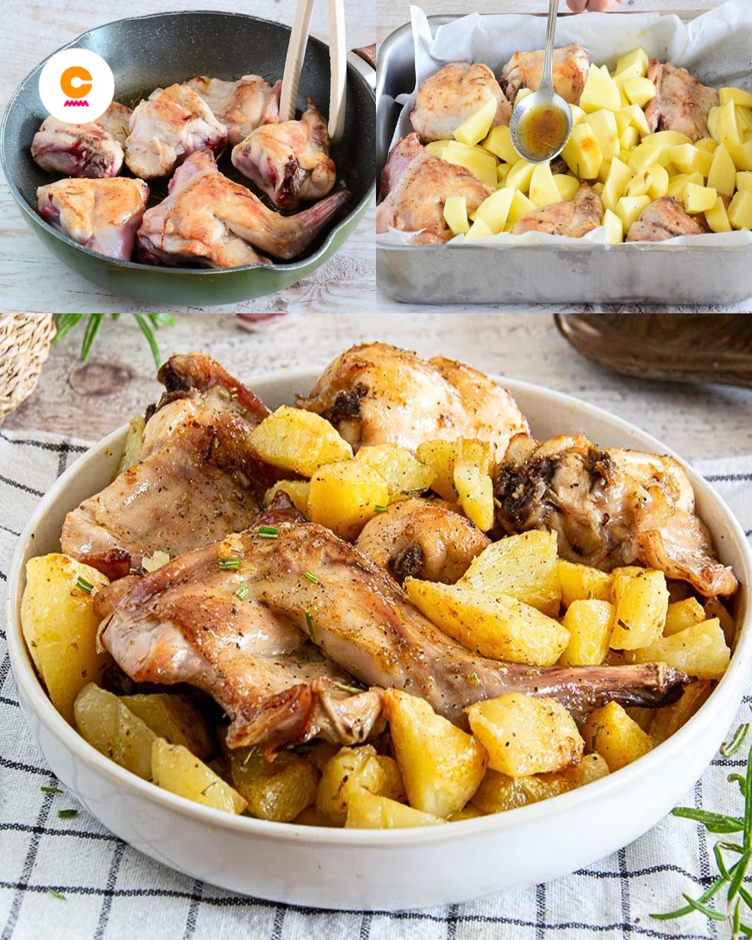 Le lapin rôti est un plat idéal pour un déjeuner dominical en famille, un plat principal rustique et savoureux, parfait pour un menu de Pâques en remplacement de l’agneau traditionnel. Préparé à partir de viande blanche et pauvre en matières grasses, le lapin de notre recette est rendu savoureux et succulent grâce à une double cuisson : d’abord dans une cocotte avec de l’ail, de l’huile, du beurre et du romarin, puis au four avec des pommes de terre et arrosé du jus de cuisson. Le résultat : un lapin doré à l’extérieur et fondant en bouche à l’intérieur, tout simplement irrésistible.