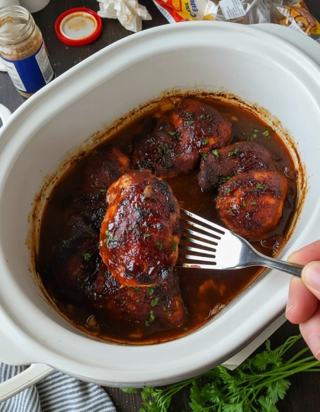 Ces cuisses de poulet BBQ à la mijoteuse sont un vrai bonheur en semaine : quelques ingrédients seulement, cinq minutes de préparation, et la mijoteuse fait le reste. Le résultat ? Une viande tendre et fondante, enrobée d’épices fumées et de votre sauce BBQ préférée.