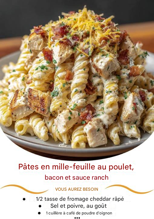 Ces pâtes au poulet, bacon et sauce ranch sont un vrai sauveur en semaine : de tendres rotinis mélangés à du bacon croustillant, du poulet rôti juteux et une onctueuse sauce au fromage et à la sauce ranch. Copieux et savoureux, ce plat est prêt en seulement une demi-heure, idéal pour les soirs où l'on a envie d'un repas délicieux sans passer des heures en cuisine.