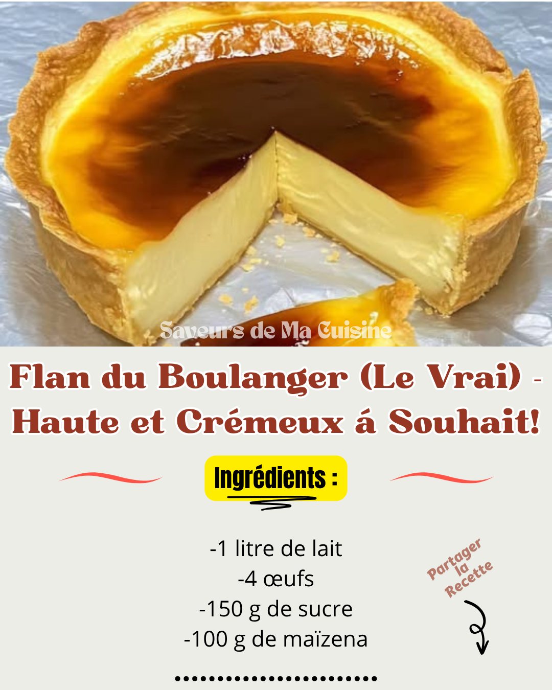 Ce flan pâtissier est épais, lisse, bien pris mais incroyablement crémeux, avec une texture fondante qui se tient parfaitement à la découpe. Facile à réaliser, économique et inratable, c’est le dessert idéal pour un goûter familial, un dessert du dimanche ou même pour impressionner des invités.